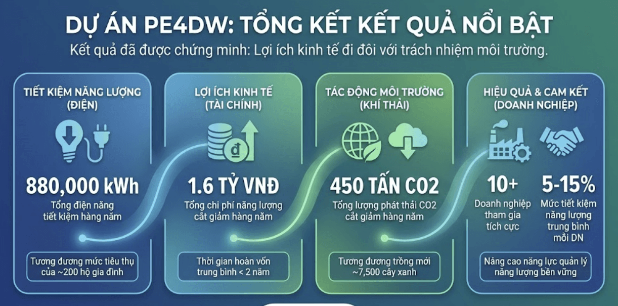 Dự án “Cải thiện Hiệu quả Năng lượng cho Doanh nghiệp Sản xuất thuộc dự án PE4DW” đã chính thức khép lại với những kết quả ấn tượng, vượt mong đợi ban đầu. Thông qua sự kết hợp bài bản giữa các can thiệp kỹ thuật và thiết lập hệ thống quản lý theo tiêu chuẩn ISO 50001, dự án đã chứng minh rằng việc cải thiện hiệu quả năng lượng tại các doanh nghiệp vừa và nhỏ (SMEs) là hoàn toàn khả thi cả về mặt kỹ thuật lẫn tài chính.